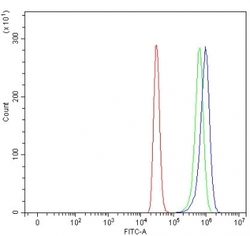 - Flow cytometry testing of fixed and permeabilized human HepG2 cells with TTC39B antibody at 1ug/million cells (blocked with goat sera); Red=cells alone, Green=isotype control, Blue= TTC39B antibody.