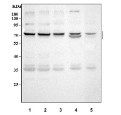- Western blot testing of 1) human 293T, 2) human Raji, 3) human K562, 4) rat testis and 5) mouse testis tissue lysate with TTC39B antibody. Predicted molecular weight: 59-77 kDa, ~23 kDa (multiple isoforms).