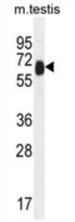 - TTC39B Antibody (C-term) (AP54399PU-N) western blot analysis in mouse testis tissue lysates (35 µg/lane). This demonstrates the TTC39B antibody detected the TTC39B protein (arrow).