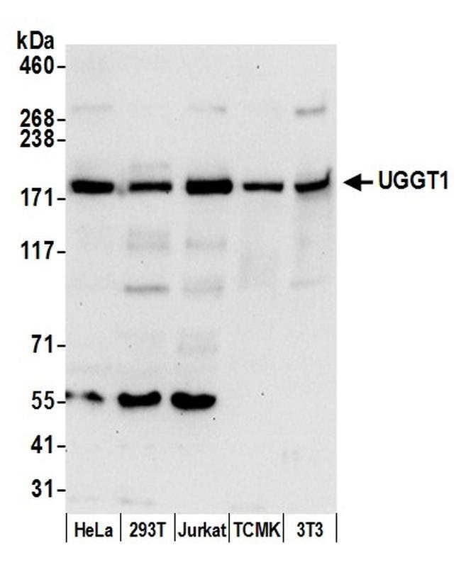 - Detection of human and mouse UGGT1 by western blot. Samples: Whole cell lysate (50 µg) from HeLa, 293T, Jurkat, mouse TCMK-1, and mouse NIH3T3 cells prepared using NETN lysis buffer. Antibody: Affinity purified rabbit anti-UGGT1 antibody A305-529A-M (lot A305-529A-M-1) used for WB at 1:1000. Detection: Chemiluminescence with an exposure time of 30 seconds.