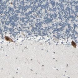 - Immunohistochemical staining of human cerebellum shows distinct cytoplasmic and nuclear positivity in purkinje cells.