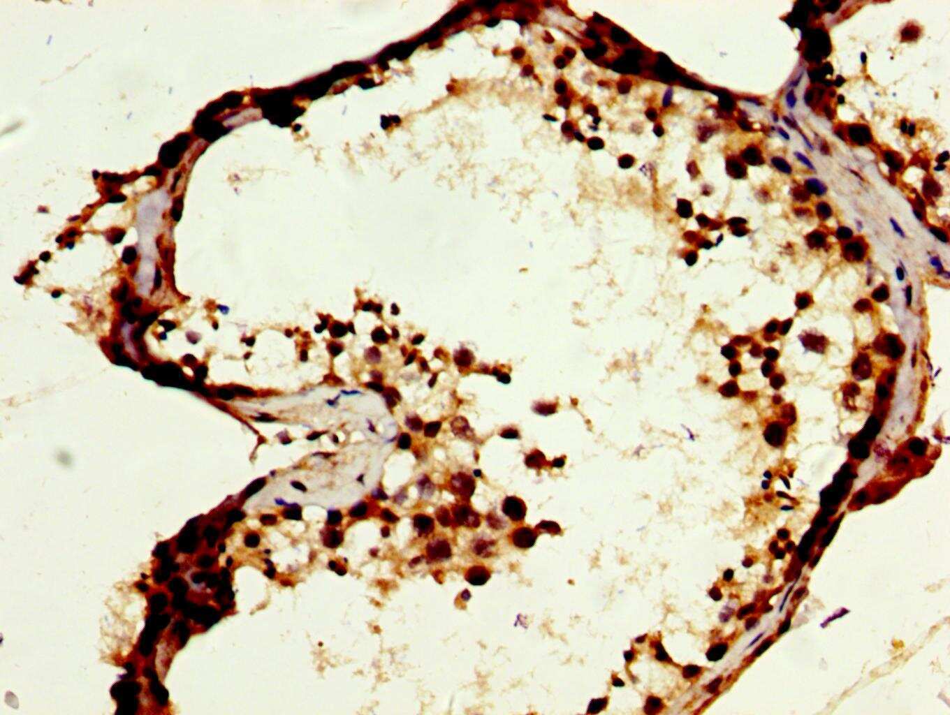 - Immunohistochemical analysis of MOS in paraffin embedded human testis tissue using a MOS polyclonal antibody (Product # PA5-97978) at a dilution of 1:400. After dewaxing and hydration, antigen retrieval was mediated by high pressure in a citrate buffer (pH 6.0). Section was blocked with 10% normal goat serum 30min at RT. Then primary antibody (1% BSA) was incubated at 4°C overnight. The primary is detected by a biotinylated secondary antibody and visualized using an HRP conjugated SP system.