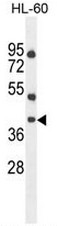 - CXorf58 Antibody (C-term) (Cat. #AP51148PU-N) western blot analysis in HL-60 cell line lysates (35µg/lane).This demonstrates the CXorf58 antibody detected the CXorf58 protein (arrow).