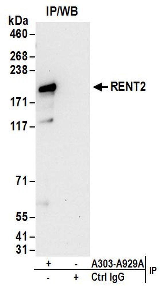 - Detection of human RENT2 by western blot of immunoprecipitates. Samples: Whole cell lysate (1 mg for IP; 20% of IP loaded) from 293T cells. Antibodies: Affinity purified rabbit anti-RENT2 antibody A303-929A (lot A303-929A-1) used for IP at 6 µg/mg lysate. For blotting immunoprecipitated RENT2, A303-929A was used at 1 µg/ml. Detection: Chemiluminescence with an exposure time of 30 seconds.