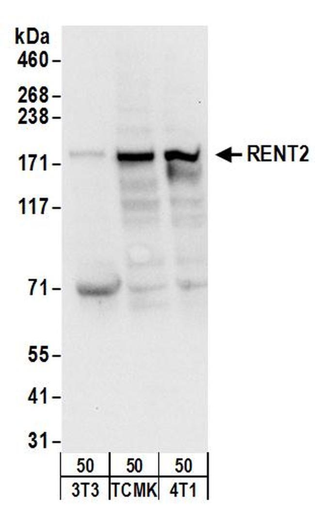 - Detection of mouse RENT2 by western blot. Samples: Whole cell lysate from mouse NIH3T3 (50µg), TCMK-1 (50µg), and 4T1 (50µg) cells. Antibodies: Affinity purified rabbit anti-RENT2 antibody A303-929A (lot A303-929A-1) used for WB at 1 µg/ml. Detection: Chemiluminescence with an exposure time of 10 seconds.