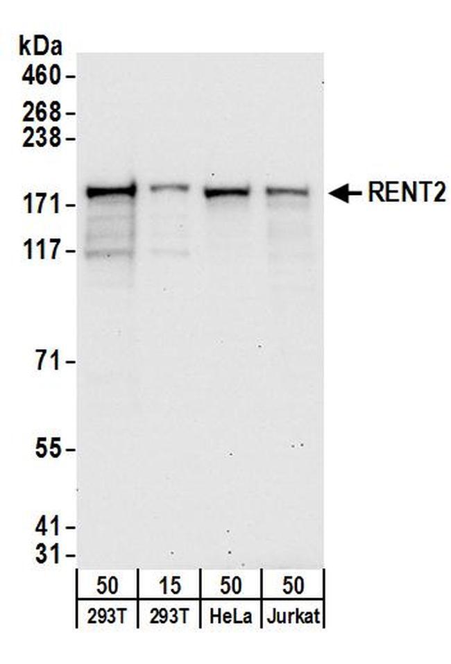 - Detection of human RENT2 by western blot. Samples: Whole cell lysate from 293T (15 and 50 µg), HeLa (50µg), and Jurkat (50µg) cells. Antibodies: Affinity purified rabbit anti-RENT2 antibody A303-929A (lot A303-929A-1) used for WB at 0.4 µg/ml. Detection: Chemiluminescence with an exposure time of 30 seconds.