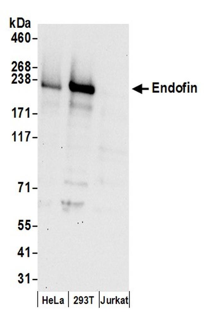 - Detection of human Endofin by western blot. Samples: Whole cell lysate (50 µg) from HeLa, 293T, and Jurkat cells prepared using NETN lysis buffer. Antibodies: Affinity purified rabbit anti-Endofin antibody A304-575A (lot A304-575A-1) used for WB at 0.1 µg/ml. Detection: Chemiluminescence with an exposure time of 30 seconds.