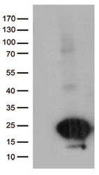 - HEK293T cells were transfected with the pCMV6-ENTRY control. (Left lane) or pCMV6-ENTRY C20orf79. (Right lane) cDNA for 48 hrs and lysed. Equivalent amounts of cell lysates. (5 ug per lane) were separated by SDS-PAGE and immunoblotted with anti-C20orf79. (1:500)