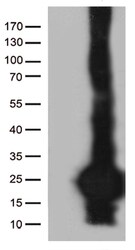 - HEK293T cells were transfected with the pCMV6-ENTRY control (Left lane) or pCMV6-ENTRY C20orf79 (RC211269, Right lane) cDNA for 48 hrs and lysed. Equivalent amounts of cell lysates (5 µg per lane) were separated by SDS-PAGE and immunoblotted with anti-C20. Positive lysates LY405885 (100 µg) and LC405885 (20 µg) can be purchased separately from OriGene.