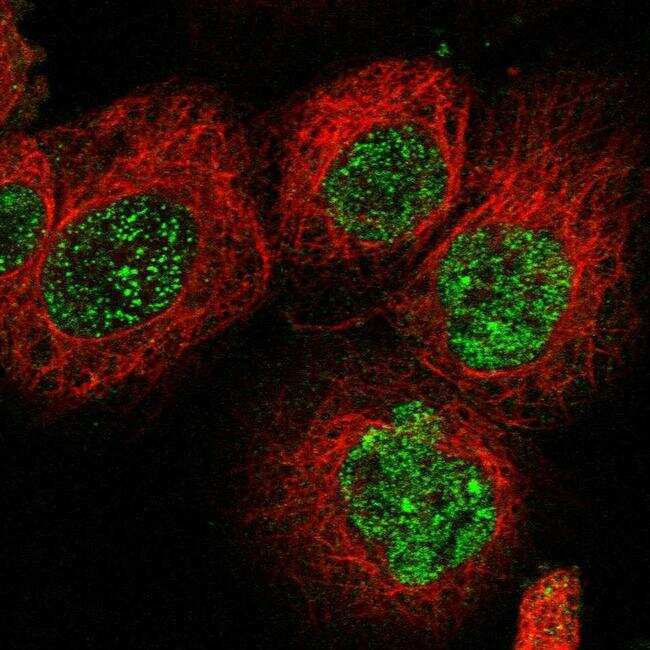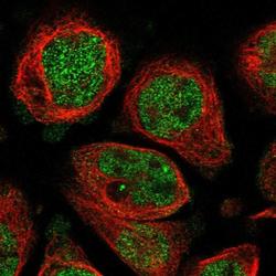 - Immunofluorescent staining of C21orf58 in human cell line A-431 using a C21orf58 Polyclonal Antibody (Product # PA5-57157) shows localization to nucleoplasm and nuclear bodies.