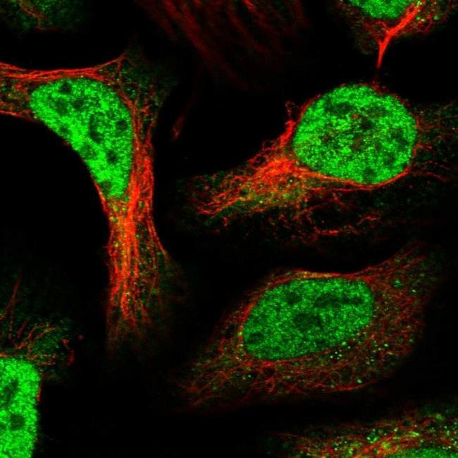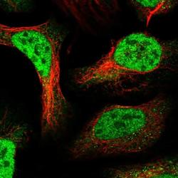 - Immunofluorescent staining of EVI5L in human cell line U-2 OS shows positivity in nucleus but excluded from the nucleoli. Samples were probed using an EVI5L Polyclonal Antibody (Product # PA5-60238).