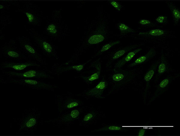 - Immunofluorescence of purified MaxPab antibody to ZCCHC9 on HeLa cell. [antibody concentration 10 ug/ml]