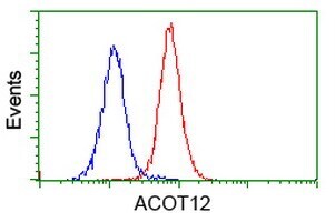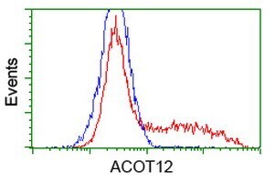 - HEK293T cells transfected with either RC210445 overexpress plasmid (Red) or empty vector control plasmid (Blue) were immunostained by anti-ACOT12 antibody (TA502530), and then analyzed by flow cytometry.