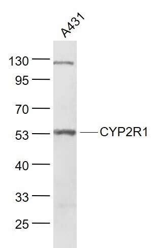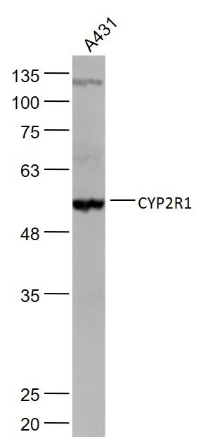 - Lane 1: A431 cell lysates probed with CYP2R1 Polyclonal Antibody, Unconjugated (bs-3900R) at 1:1000 dilution and 4°C overnight incubation. Followed by conjugated secondary antibody incubation at 1:20000 for 60 min at 37°C.