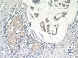 - Immunohistochemistry of paraffin-embedded human breast cancer tissue slide using 12935-1-AP (RASGAP antibody at dilution of 1:50 (under 40x lens).