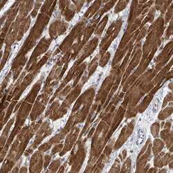 - Immunohistochemical analysis of FAM47B in human heart muscle using FAM47B Polyclonal Antibody (Product # PA5-62285) shows strong cytoplasmic positivity in myocytes.