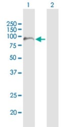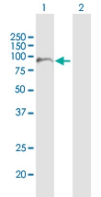 - Western Blot: FAM47B Antibody [H00170062-B01P] - Analysis of FAM47B expression in transfected 293T cell line by FAM47B polyclonal antibody. Lane 1: FAM47B transfected lysate(70.95 KDa). Lane 2: Non-transfected lysate.