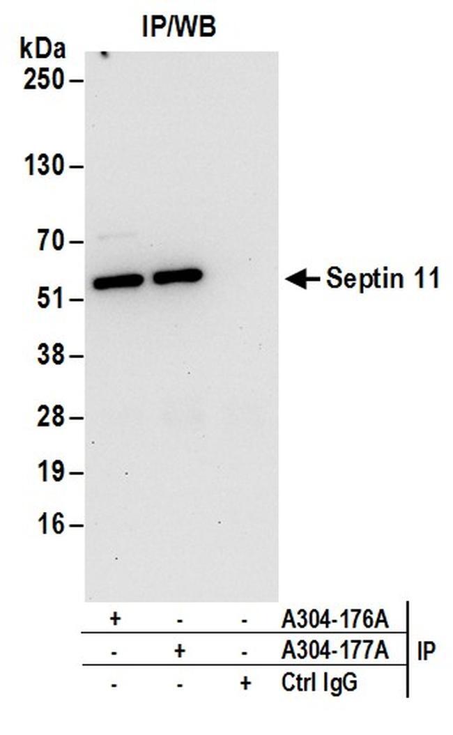 - Detection of human Septin 11 by western blot of immunoprecipitates. Samples: Whole cell lysate (1 mg for IP; 20% of IP loaded) from HeLa cells. Antibodies: Affinity purified rabbit anti-Septin 11 antibody A304-176A (lot A304-176A-1) used for IP at 6 µg/mg lysate. Septin 11 was also immunoprecipitated by rabbit anti-Septin 11 antibody A304-177A. For blotting immunoprecipitated Septin 11, A304-176A was used at 0.2 µg/ml. Detection: Chemiluminescence with an exposure time of 30 seconds.