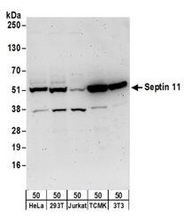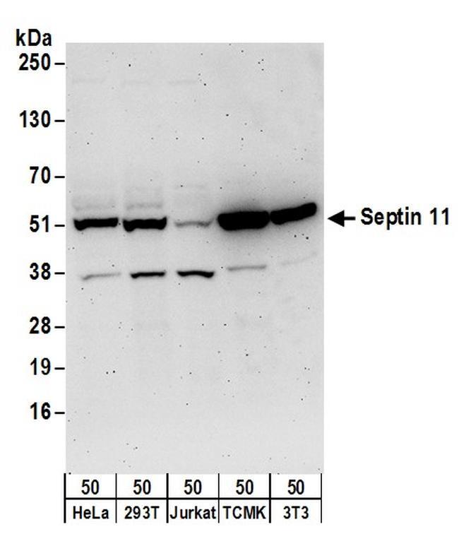 - Detection of human and mouse Septin 11 by western blot. Samples: Whole cell lysate (50 µg) from HeLa, 293T, Jurkat, mouse TCMK-1, and mouse NIH3T3 cells. Antibodies: Affinity purified rabbit anti-Septin 11 antibody A304-176A (lot A304-176A-1) used for WB at 0.2 µg/ml. Detection: Chemiluminescence with an exposure time of 3 minutes.