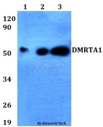 - Western blot (WB) analysis of DMRTA1 pAb at 1:500 dilutionLane1:HEK293T whole cell lysateLane2:Raw264.7 whole cell lysate Lane3:PC12 whole cell lysate