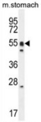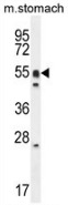 - Western blot analysis in mouse stomach cell line lysates (35ug/lane) using DMRTA1 / DMO antibody Cat.-No. AP51280PU-N. This demonstrates this antibody detected the DMRTA1 protein (arrow).