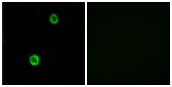 - Immunofluorescence analysis of MCF-7 cells, using CST1 antibody. The picture on the right is treated with the synthesized peptide.