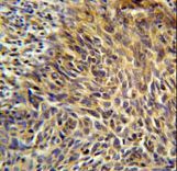 - ANKRD32 Antibody immunohistochemistry of formalin-fixed and paraffin-embedded human cervix carcinoma followed by peroxidase-conjugated secondary antibody and DAB staining.