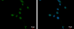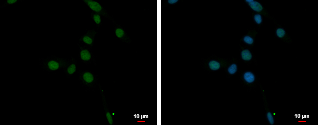- ANKRD32 antibody detects ANKRD32 protein at nucleus by immunofluorescent analysis.Sample: U87-MG cells were fixed in 4% paraformaldehyde at RT for 15 min.Green: ANKRD32 protein stained by ANKRD32 antibody (GTX122500) diluted at 1:500.Blue: Hoechst 33342 staining.Scale bar = 10 £gm.