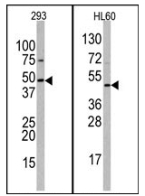 - Western blot analysis of anti-hSUV39H2-K315 Pab (Cat.#AP11274PU-N) in 293 and HL60 cell line lysates (35ug/lane). hSUV39H2-K315(arrow) was detected using the purified Pab (1:62 dilution).