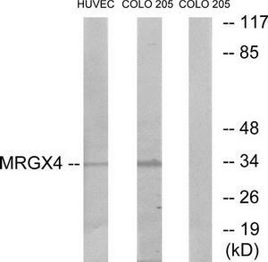 - Western blot analysis of extracts from HUVEC cells and COLO cells, using MRGX4 antibody.The lane on the right is treated with the synthesized peptide.
