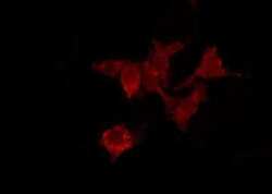 - Immunofluorescent analysis of MRGPRX4 in HUVEC cell lysate. Samples were fixed with paraformaldehyde, permeabilized with 0.1% Triton X-100, blocked with 10% serum (45 min at 25°C) incubated with MRGPRX4 polyclonal antibody (Product # PA5-103215) using a dilution of 1:200 (1 hr, 37°C), and followed by goat anti-rabbit IgG Alexa Fluor 594 at a dilution of 1:600.