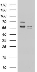 - HEK293T cells were transfected with the pCMV6-ENTRY control (Left lane) or pCMV6-ENTRY MTDH (RC207238, Right lane) cDNA for 48 hrs and lysed. Equivalent amounts of cell lysates (5 µg per lane) were separated by SDS-PAGE and immunoblotted with anti-MTDH. Positive lysates LY403614 (100 µg) and LC403614 (20 µg) can be purchased separately from OriGene.