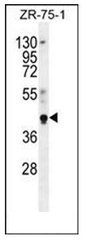 - Western blot analysis of PYGO1 Antibody (C-term) Cat.-No AP53530PU-N in ZR-75-1 cell line lysates (35ug/lane). This demonstrates the PYGO1 antibody detected the PYGO1 protein (arrow).