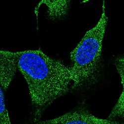 - Immunofluorescent staining of human cell line U-2 OS shows localization to vesicles.