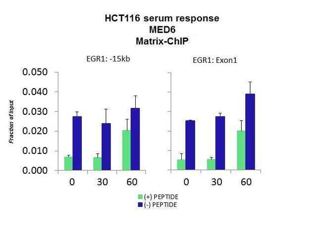 - ChIP assay analysis of quiescent human colon carcinoma HCT116 cells using an anti-MED6 polyclonal antibody (Product # PA5-40845).