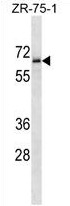 - TM117 Antibody (C-term) (AP54273PU-N) western blot analysis in ZR-75-1 cell line lysates (35 µg/lane). This demonstrates the TM117 antibody detected the TM117 protein (arrow).