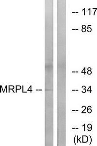 - Western blot analysis of extracts from COLO cells, using MRPL4 antibody.The lane on the right is treated with the synthesized peptide.