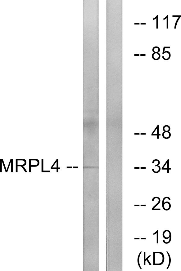 - Western blot analysis of lysates from COLO cells, using MRPL4 Antibody. The lane on the right is blocked with the synthesized peptide.