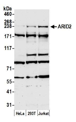 - Detection of human ARID2 by western blot. Samples: Whole cell lysate (50 µg) from HeLa, HEK293T, and Jurkat cells prepared using NETN lysis buffer. Antibody: Affinity purified rabbit anti-ARID2 antibody (Product # A302-230A; lot A302-230A-2) used for WB at 0.04 µg/mL. Detection: Chemiluminescence with an exposure time of 75 seconds.