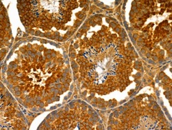 - Immunohistochemistry analysis of ENDOGL1 in mouse testis tissue. The sample was formaldehyde fixed and a heat mediated antigen retrieval step in citrate buffer was performed. Samples were incubated with ENDOGL1 polyclonal antibody (Product # PA5-101578) using a dilution of 1:100 (4°C overnight) followed by HRP conjugated anti-Rabbit secondary antibody.