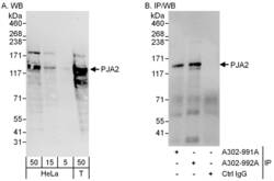 - Detection of human PJA2 by western blot and immunoprecipitation. Samples: Whole cell lysate from HeLa (5, 15 and 50 µg for WB; 1 mg for IP, 20% of IP loaded) and 293T (T; 50 µg) cells. Antibodies: Affinity purified rabbit anti-PJA2 antibody A302-992A used for WB at 0.1 µg/ml (A) and 1 µg/ml (B) and used for IP at 6 µg/mg lysate. PJA2 was also immunoprecipitated by rabbit anti-PJA2 antibody A302-991A, which recognizes an upstream epitope. Detection: Chemiluminescence with exposure times of 30 seconds (A) and 3 seconds (B).