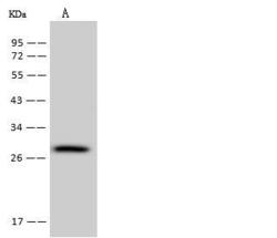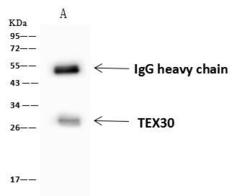 - TEX30 was immunoprecipitated using: Lane A: 0.5 mg U251MG Whole Cell Lysate. 4 uL anti-TEX30 rabbit polyclonal antibody and 60 ug of Immunomagnetic beads Protein A/G. Primary antibody: Anti-TEX30 rabbit polyclonal antibody, at 1:100 dilution. Secondary antibody: Goat Anti-Rabbit IgG (H+L)/HRP at 1/10000 dilution. Developed using the ECL technique. Performed under reducing conditions. Predicted band size: 25 kDa. Observed band size: 27 kDa.