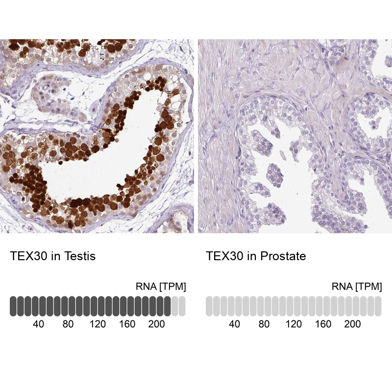 - Immunohistochemistry analysis in human testis and prostate tissues using Anti-TEX30 antibody. Corresponding TEX30 RNA-seq data are presented for the same tissues.