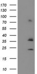 - HEK293T cells were transfected with the pCMV6-ENTRY control (Left lane) or pCMV6-ENTRY CYB5R1 (RC205833, Right lane) cDNA for 48 hrs and lysed. Equivalent amounts of cell lysates (5 µg per lane) were separated by SDS-PAGE and immunoblotted with anti-CYB5R. Positive lysates LY402525 (100 µg) and LC402525 (20 µg) can be purchased separately from OriGene.