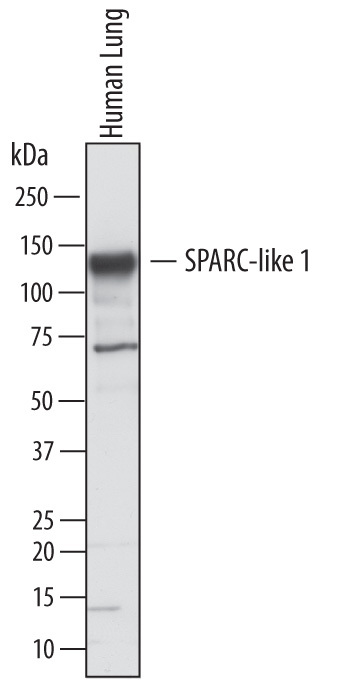 - Detection of Human SPARC-like 1/SPARCL1 by Western Blot. Western blot shows lysates of human lung tissue. PVDF membrane was probed with 1 µg/mL of Goat Anti-Human SPARC-like 1/ SPARCL1 Antigen Affinity-purified Polyclonal Antibody (Catalog # AF2728) followed by HRP-conjugated Anti-Goat IgG Secondary Antibody (Catalog # HAF017). A specific band was detected for SPARC-like 1/SPARCL1 at approximately 130 kDa (as indicated). This experiment was conducted under reducing conditions and using Immunoblot Buffer Group 1.