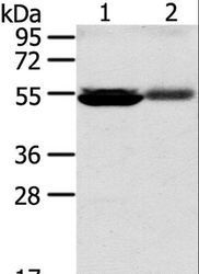 - Western blot analysis of Human kidney pericarcinous and kidney cancer tissue, using SLC17A1 Polyclonal Antibody at dilution of 1:200.