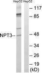 - Western blot analysis of extracts from HepG2 cells, using SLC17A2 Antibody. The lane on the right is treated with the synthesized peptide.