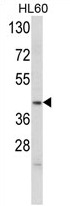 - Western blot analysis of APOL4 Antibody (Center E273) (AP17119PU-N) in HL60 cell line lysates (35 µg/lane). APOL4 (arrow) was detected using the purified Pab.