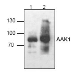 - Western blot analysis of AAK1 expression in 3T3 cell lysate (Lane 1) and rat Kidney tissue lysate (Lane 2).