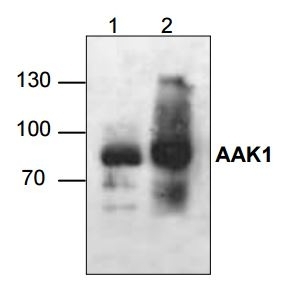 - Western Blot: 1. 3T3 cell lysate 2. Rat kidney tissue lysate stained with anti-AAK1 antibody (ARG20257). The antibody recognizes ~95 kDa AAK1 in samples from human, mouse and rat origins.